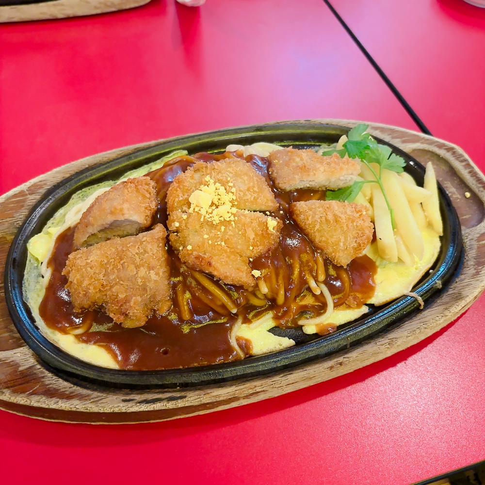 鉄板皿の上に薄く溶き卵が焼かれてて、その上に餡掛けスパゲッティとさらに具が乗っているスタイル🍤